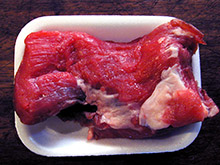Beef can be cut into steak, pot roasts, short ribs, or ground into hamburger. Several Asian and European nationalities include the blood in their cuisine as well -- it is used in some varieties of blood sausage, and Filipinos use it to make a stew called dinuguan. Other beef variety meats include the tongue, which is usually sliced for sandwiches in Western cooking; tripe from the stomach; various glands particularly the pancreas and thyroid referred to as sweetbreads; the heart, the brain, the liver, the kidneys; and the tender testicles of the bull commonly known as "beef balls", "calf fries", "prairie oysters", or "Rocky Mountain oysters." The better cuts are usually obtained from steers, as heifers tend to be kept for breeding. Older animals are used for beef when they are past their reproductive prime. The meat from older cows and bulls is generally tougher, so it is frequently used for ground beef. Cattle raised for beef may be allowed to roam free on grasslands, or may be confined at some stage in pens as part of a large feeding operation called a feedlot. The United States, Brazil, the EU, China, and India, are the world's five largest producers of beef. Beef production is also important to the economy of Argentina, the Russian Federation, Australia, Mexico, and Canada. Beef is first divided into primal cuts. These are basic sections from which steaks and other subdivisions are cut. The following is a list of the primal cuts, ordered front to back, then top to bottom. The short loin and the sirloin are sometimes considered as one section. When looking at a diagram such as the one above, note that the closer to the middle back, the more tender the meat is. Since the animal's legs and neck muscles do the most work, they are the toughest; the meat becomes progressively more tender as distance from "hoof and horn" increases. upper half Chuck - one of the most common sources for hamburger. Rib Short Loin - the most tender, and the most expensive; from which porterhouse steaks, and filet mignon are cut. Sirloin - less tender than short loin, but more flavorful. Round lower half Brisket and Shank Plate Flank