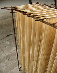 A noodle is a thin strip of pasta, usually cut or extruded from some kind of dough. It is the basic unit in dishes like spaghetti, linguine, soba, and udon. The term often refers to moist, cooked pasta, since it has connotations of curviness and slipperiness, but also to dried noodles that must be reconstituted by boiling or soaking in water.